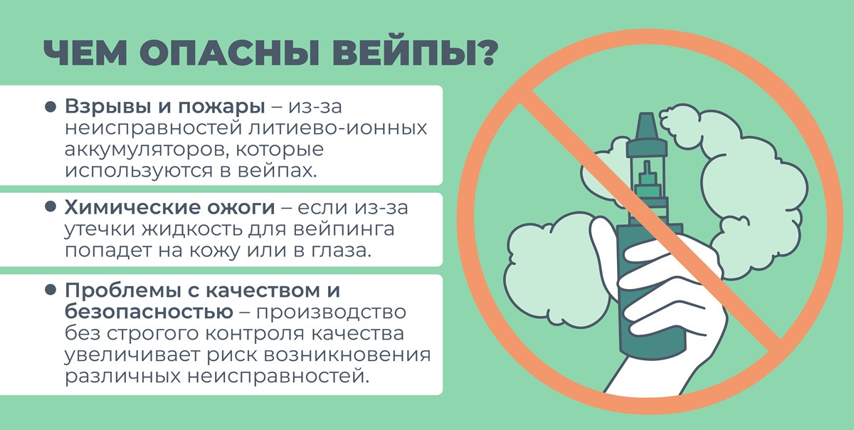 • Общее использование одного вейпа может привести к передачи инфекционных заболеваний таких как гепатит и туберкулез.