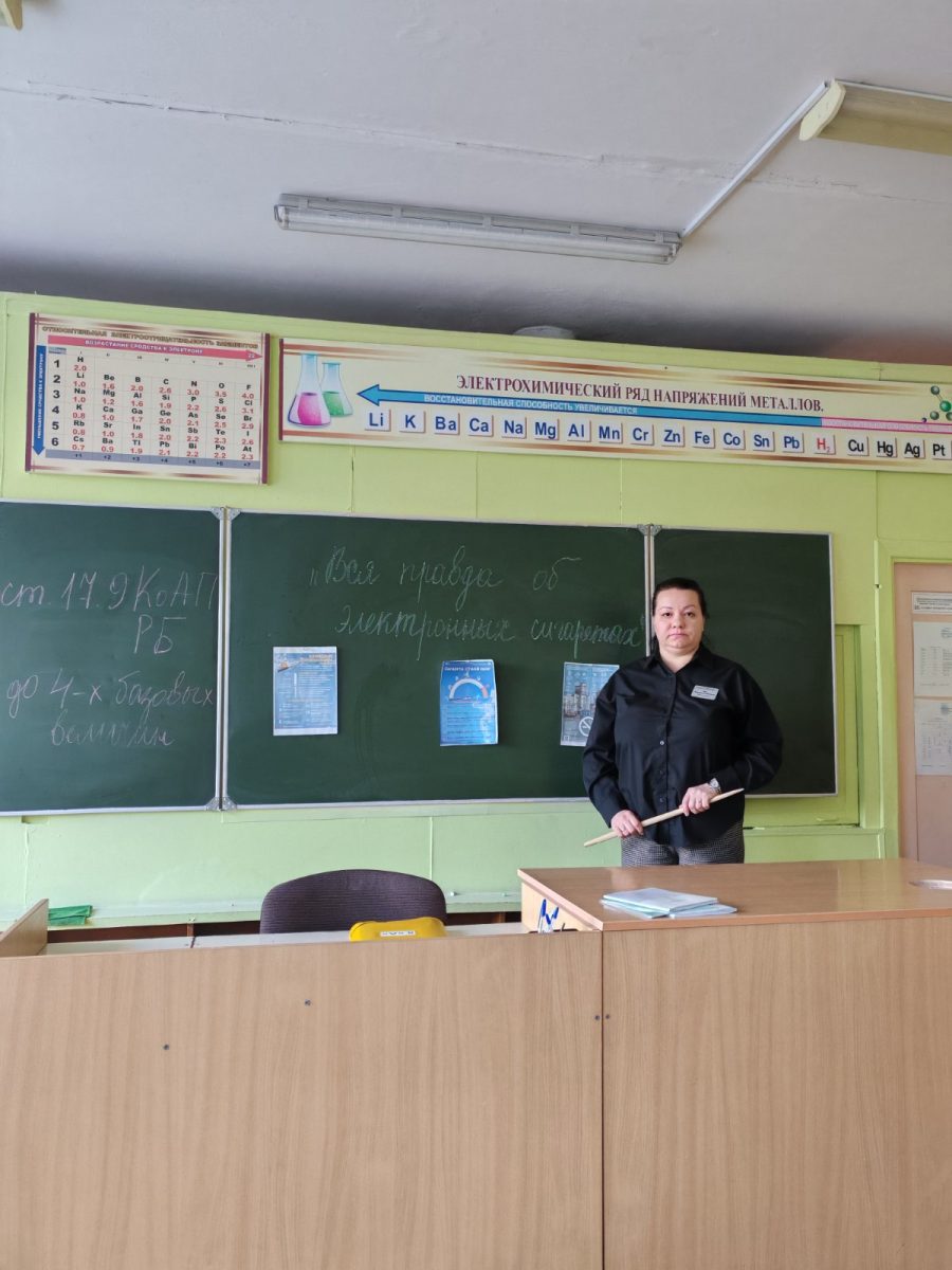 18-19.11.2025 и 19 ноября в 8а и 9а классах прошли классные часы с участием педагога социального Реут Е. О. по теме “Вся правда об электронных сигаретах”, на которых уделено последствиям употребления электронных систем курения, доведена административная ответственность.